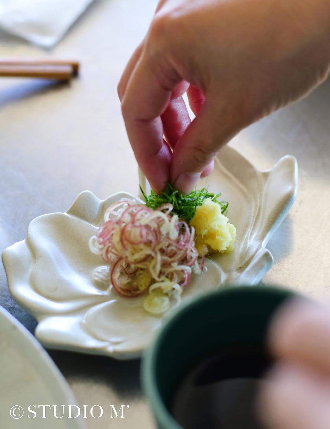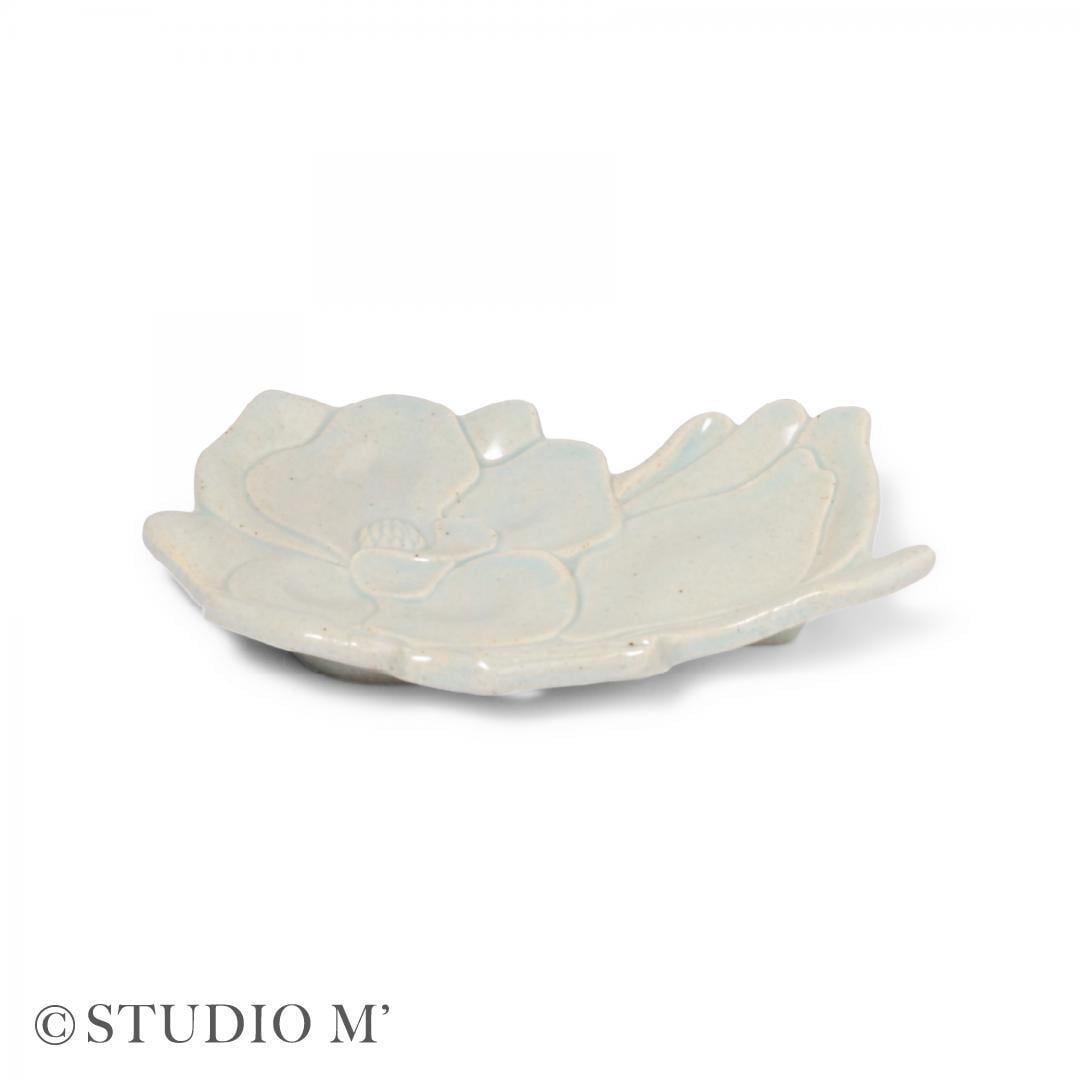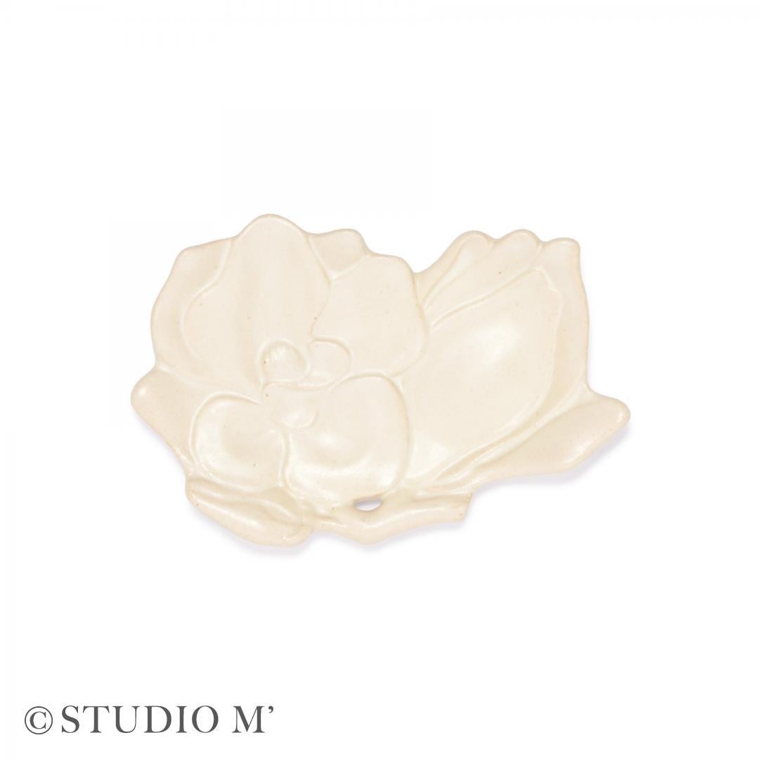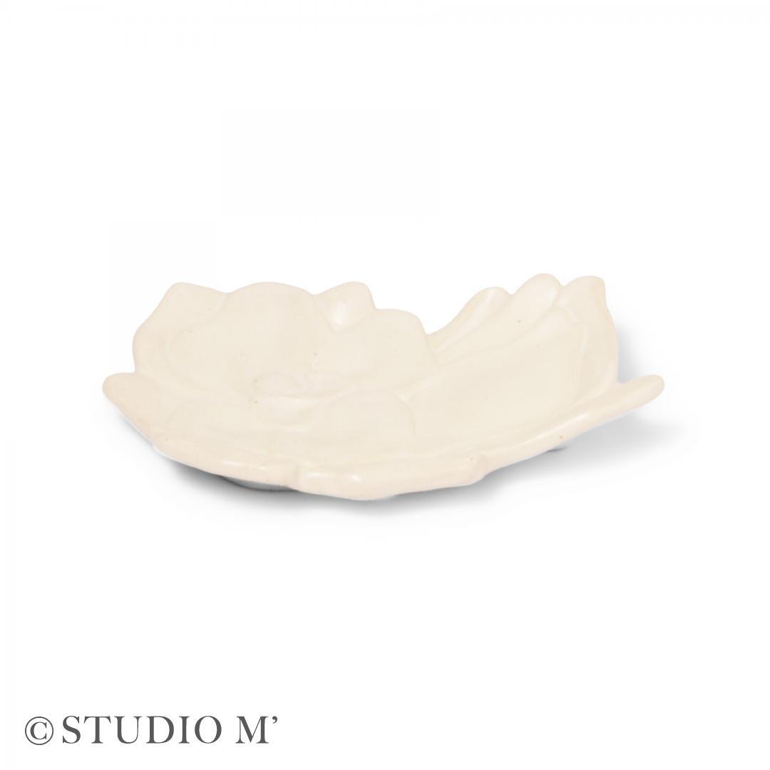 和菓子一つが際立つ菓子皿として企画しました。素朴な魅力がある白土と釉薬でモクレンを表現しました。柔らかい花びらが和菓子をふんわりと包みます。花びらの重なりは器全体に動きを与え、料理を引き立てます。来客時やおやつの時間にチョコレートや焼き菓子をのせたり、副菜を盛ると、食卓のアクセントになり食卓が華やぎます。